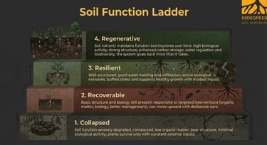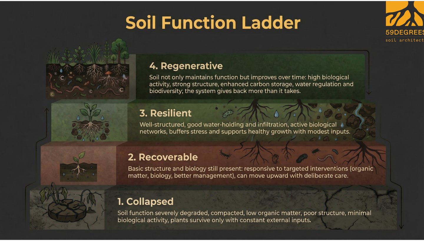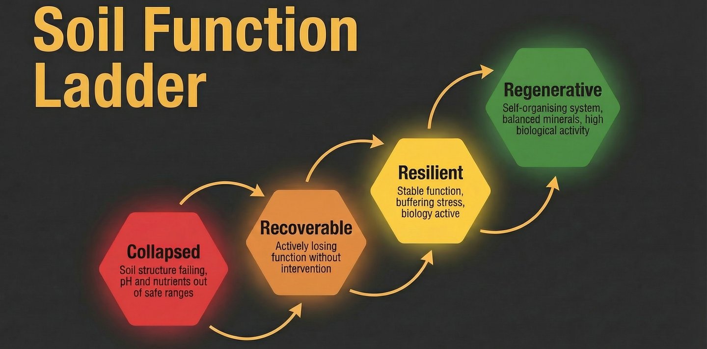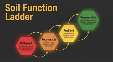 The Soil Function Ladder™ turns scattered tests, field symptoms, and soil indices into a simple four‑rung roadmap – Collapsed, Recoverable, Resilient, Regenerative – and replaces the vague “healthy/not healthy” binary with a concrete position and direction of travel.