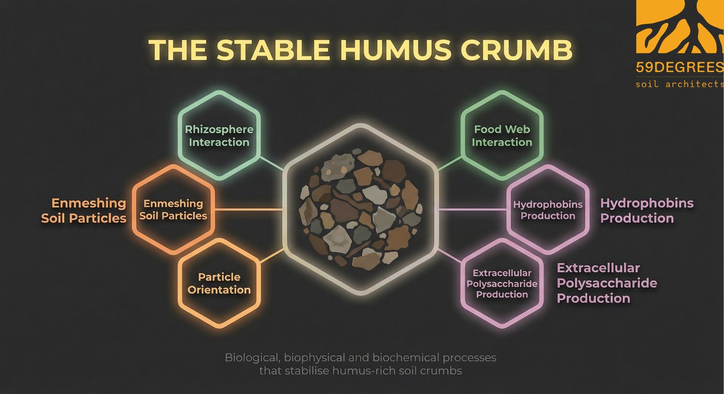 "Over a decade of working with farmers on collapsed soils has shown me they are often operating from the wrong script. A humus‑rich soil has to be grown together with the plant, carefully balanced with the soil’s mineralogy and strengthened through microbiology. Only then do we truly switch on the soil‑building process and start to see the beautiful formation of stable soil crumb. Most farmers are trying to apply “regenerative” techniques on top of collapsed soils, hoping to jump straight from Collapsed to Regenerative in one move – it is costly, and it does not work" Josef Winter founder 59degrees.